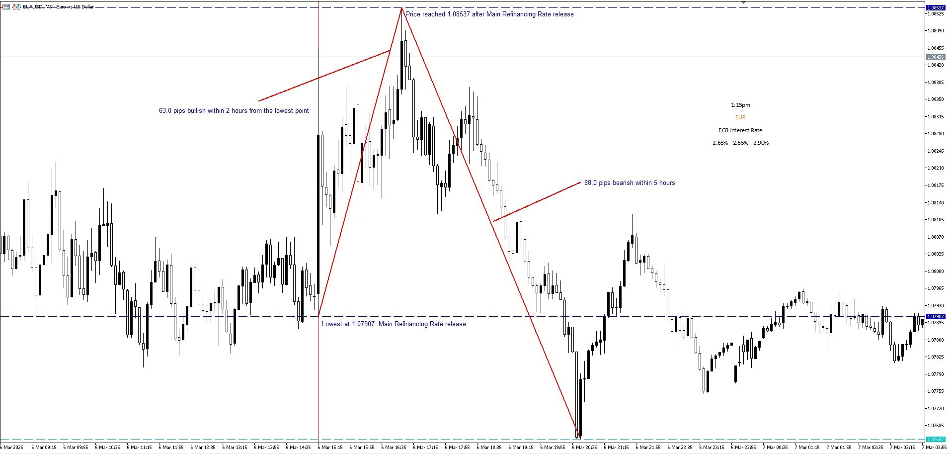 During a high-impact news release on a 5-minute candlestick, potential profit or loss could have occurred based on market entry timing. Last week 6th March, the European Central Bank's rate decision triggered significant volatility, with EUR/USD serving as a key example. In such conditions, pending orders can be a valuable tool, depending on individual trading strategies.